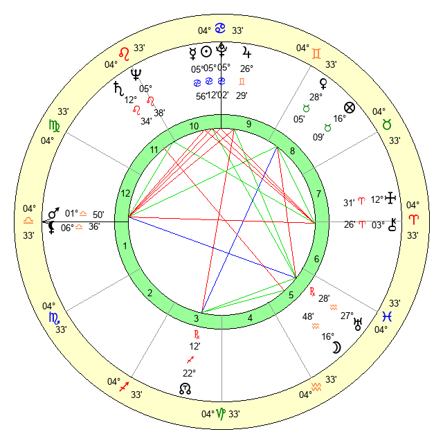 | Sun | 5 Cancer 12 | 6 Cancer 18 | 18 Libra 33 |