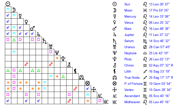 | Pluto | 26 Leo 2 | 2 Aquarius 17 | 28 Leo 5 |