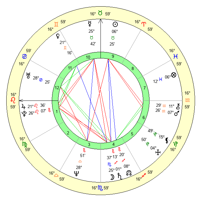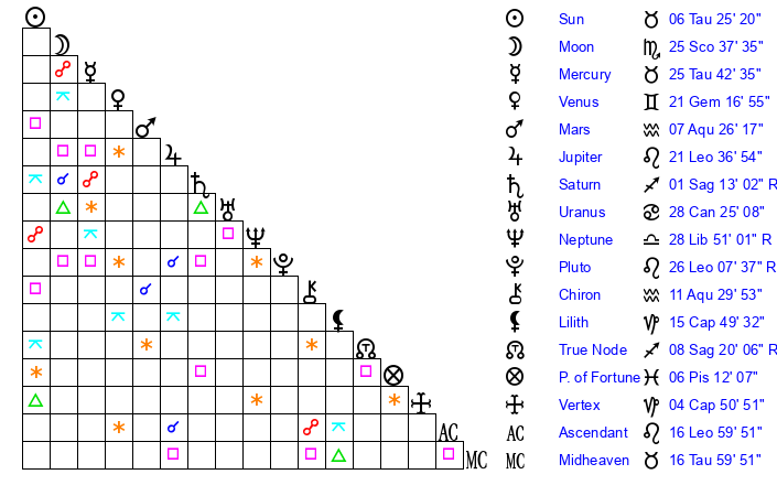 | Moon | 25 Scorpio 29 | 21 Aries 2 | 24 Taurus 19 |