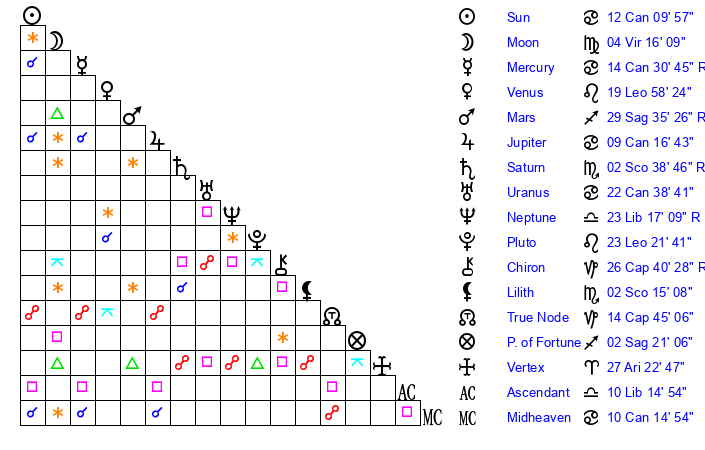 | Sun | 12 Cancer 10 | 12 Cancer 58 | 20 Virgo 21 |