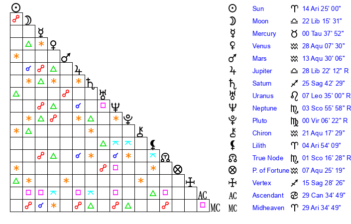 | Moon | 22 Libra 16 | 10 Cancer 26 | 4 Aries 44 |