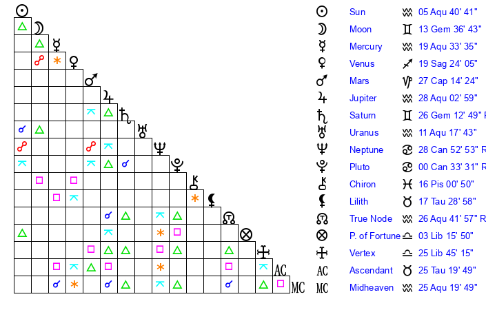 | Sun | 5 Aquarius 40 | 7 Aquarius 0 | 24 Taurus 44 |