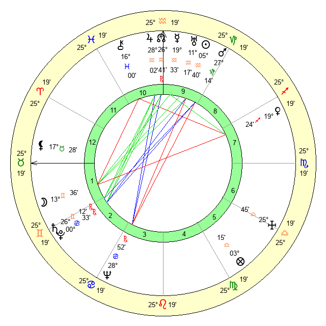 | Moon | 13 Gemini 34 | 1 Capricorn 41 | 22 Gemini 41 |