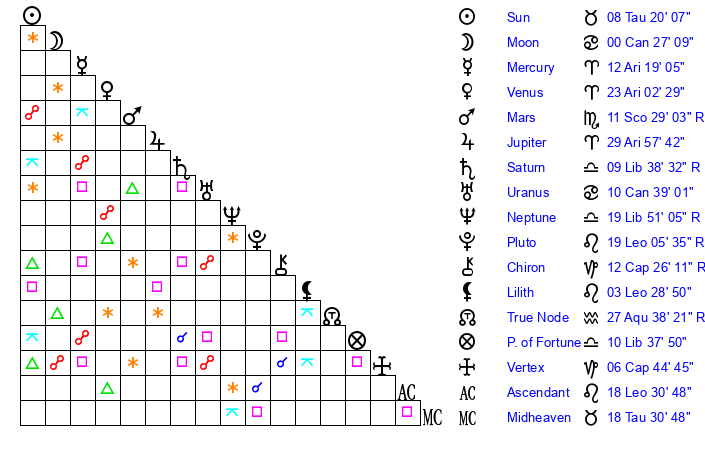| Sun | 8 Taurus 20 | 8 Taurus 39 | 18 Cancer 20 |