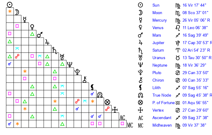 | Sun | 16 Virgo 17 | 16 Virgo 59 | 13 Sagittarius 52 |