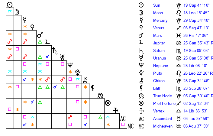| Moon | 18 Leo 15 | 20 Libra 58 | 12 Pisces 9 |