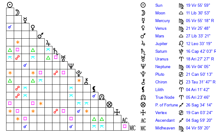 | Neptune | 6 Virgo 4 | 1 Aries 1 | 7 Virgo 59 |