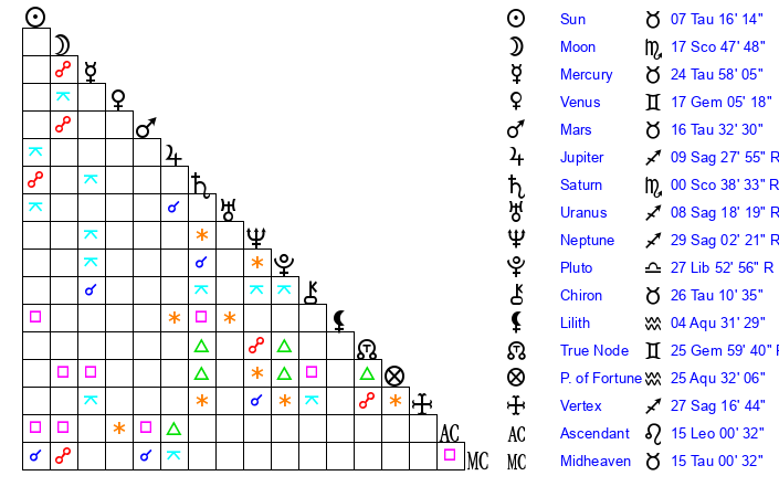 | Moon | 17 Scorpio 42 | 12 Taurus 36 | 20 Taurus 15 |