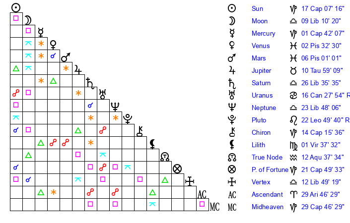 | Saturn | 27 Libra 5 | 26 Pisces 30 | 26 Libra 15 |