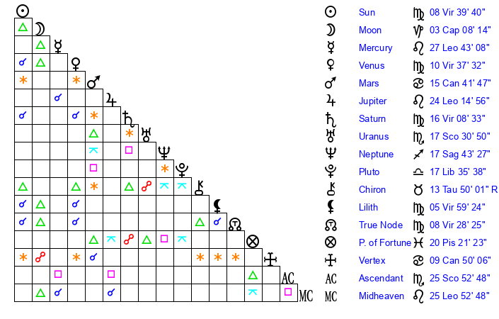 | Moon | 3 Capricorn 5 | 25 Sagittarius 29 | 16 Virgo 19 |