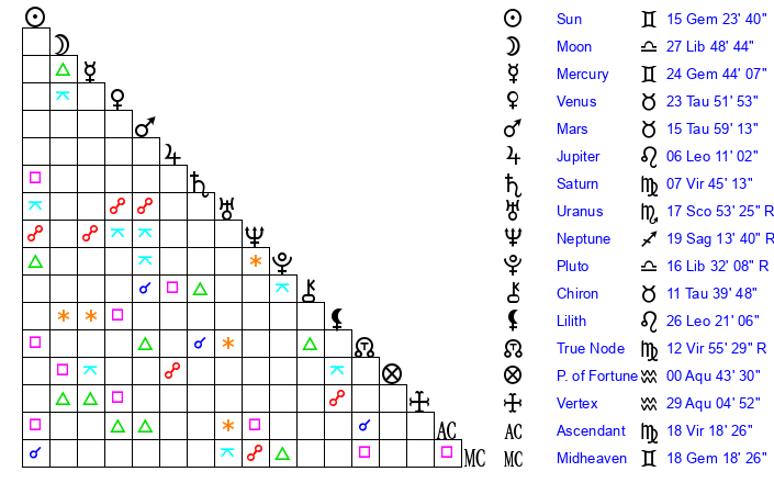 | Sun | 15 Gemini 24 | 16 Gemini 14 | 29 Cancer 17 |