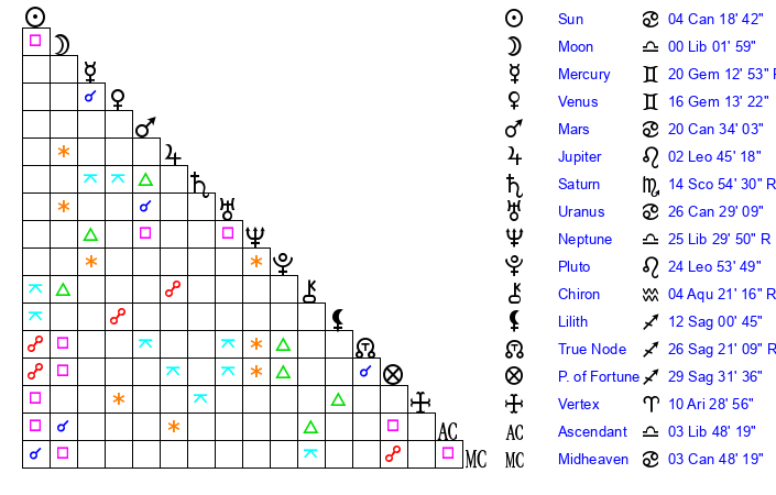 | Moon | 0 Libra 13 | 22 Cancer 20 | 11 Aries 7 |