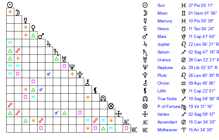 | Sun | 27 Pisces 5 | 27 Pisces 21 | 4 Gemini 26 |