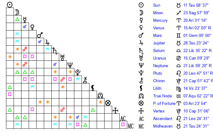 | Sun | 11 Taurus 59 | 12 Taurus 32 | 20 Cancer 58 |