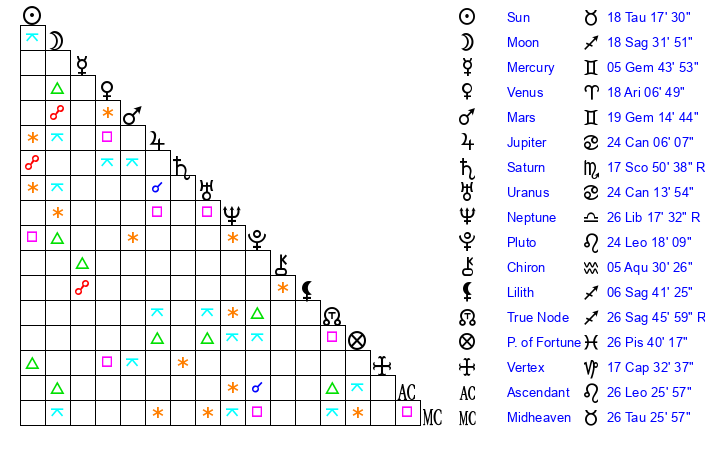 | Saturn | 18 Scorpio 23 | 28 Pisces 36 | 15 Scorpio 0 |