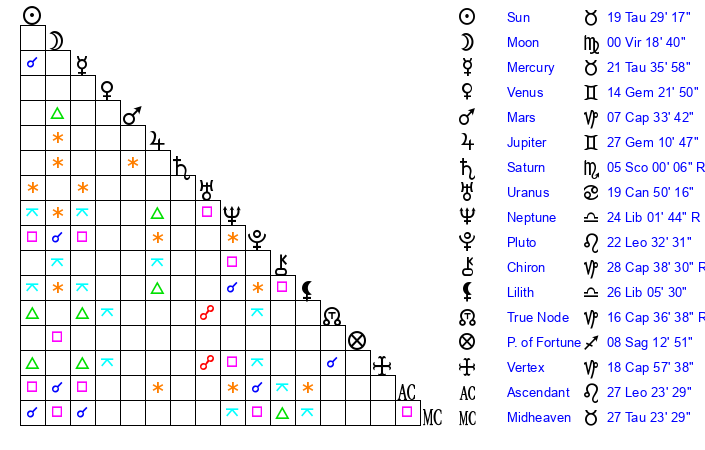 | Sun | 19 Taurus 29 | 20 Taurus 17 | 27 Cancer 25 |