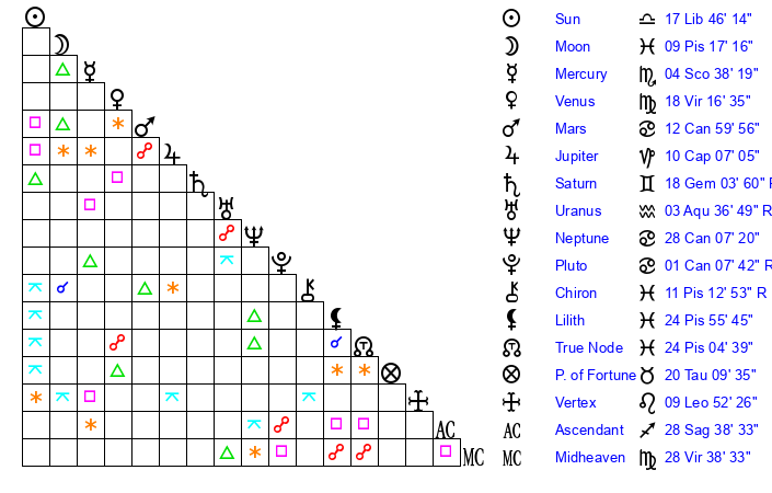 | Saturn | 18 Gemini 46 | 26 Pisces 52 | 12 Gemini 3 |
