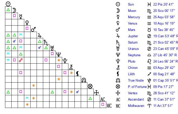 | Saturn | 21 Scorpio 33 | 22 Pisces 11 | 17 Scorpio 25 |