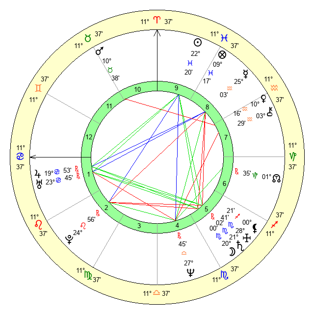| Moon | 19 Scorpio 56 | 16 Virgo 46 | 12 Gemini 40 |