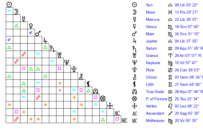 | Neptune | 10 Virgo 57 | 0 Aries 31 | 12 Virgo 17 |
