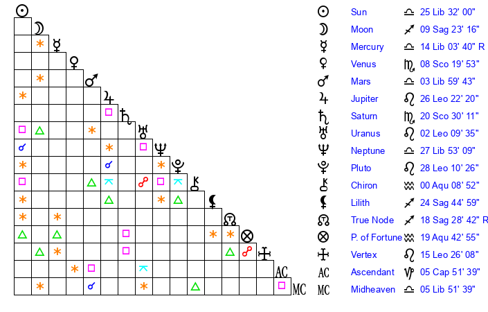 | Sun | 25 Libra 32 | 26 Libra 34 | 6 Capricorn 11 |