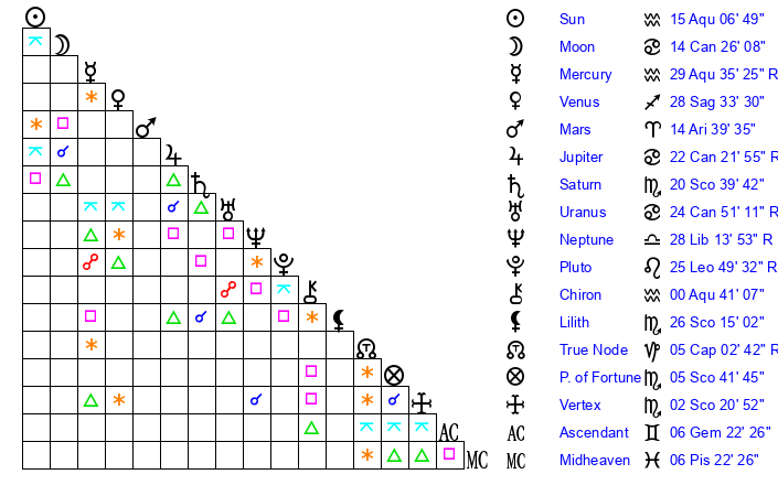 | Mars | 14 Aries 38 | 19 Cancer 27 | 3 Gemini 12 |