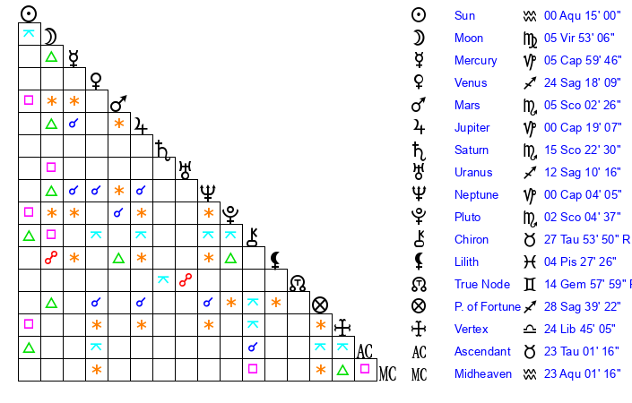 | Sun | 0 Aquarius 15 | 1 Aquarius 19 | 11 Pisces 43 |
