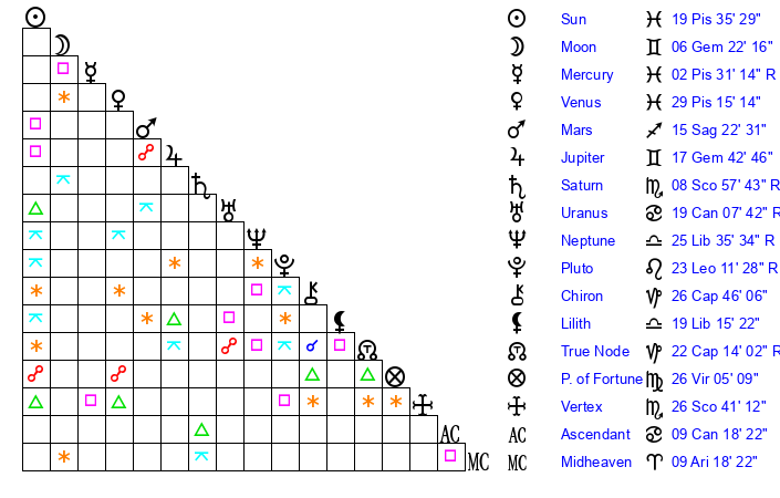 | Saturn | 9 Scorpio 29 | 21 Pisces 48 | 4 Scorpio 52 |