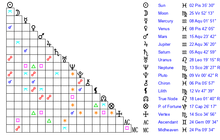| Pluto | 9 Virgo 0 | 2 Aquarius 41 | 7 Virgo 39 |