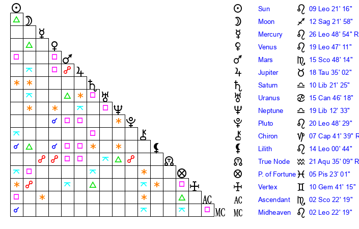 | Moon | 12 Sagittarius 17 | 11 Scorpio 41 | 21 Leo 45 |