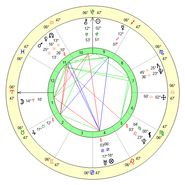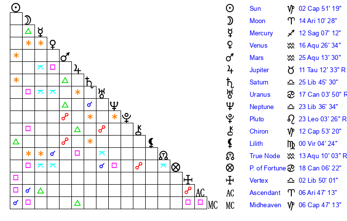 | Moon | 14 Aries 10 | 25 Aquarius 42 | 4 Sagittarius 0 |
