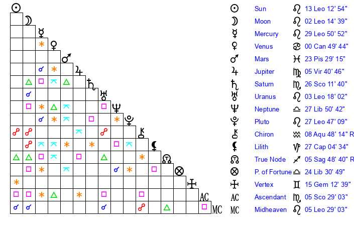 | Pluto | 27 Leo 46 | 2 Aquarius 18 | 29 Leo 51 |