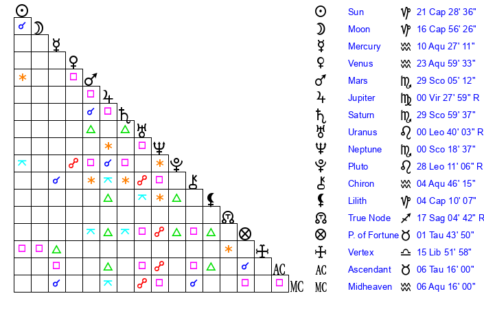 | Venus | 23 Aquarius 59 | 23 Capricorn 56 | 16 Taurus 35 |