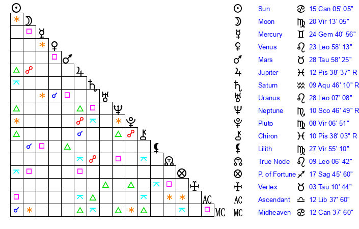| Sun | 15 Cancer 5 | 15 Cancer 50 | 15 Virgo 33 |