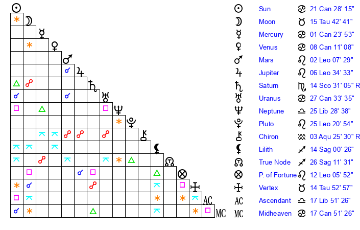 | Venus | 8 Cancer 11 | 11 Gemini 13 | 4 Libra 41 |