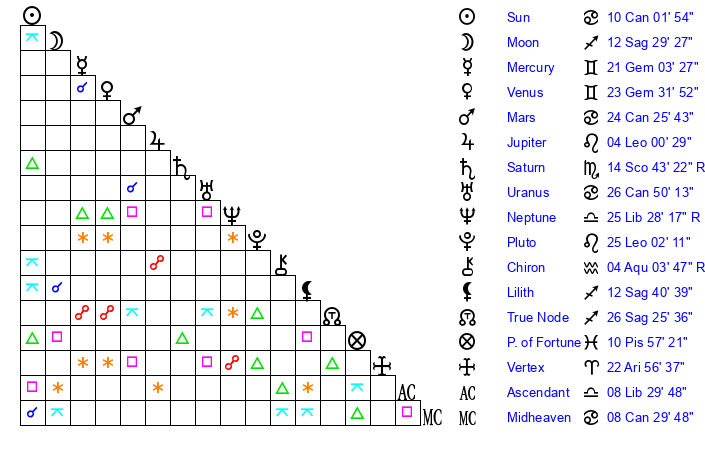 | Moon | 12 Sagittarius 31 | 9 Libra 59 | 5 Cancer 10 |