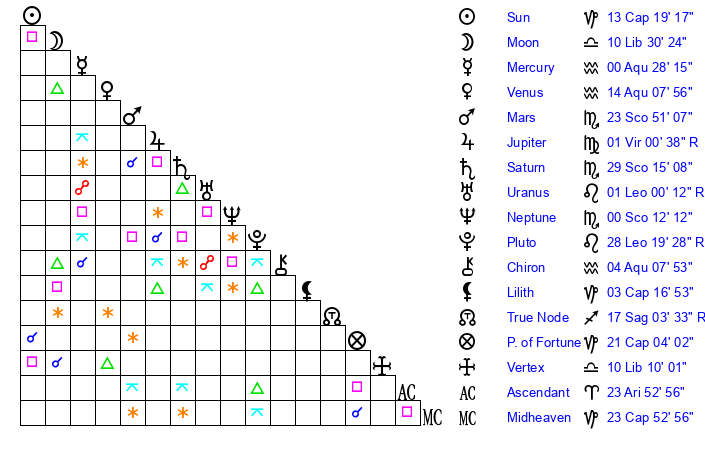 | Mars | 23 Scorpio 52 | 15 Capricorn 32 | 9 Capricorn 45 |