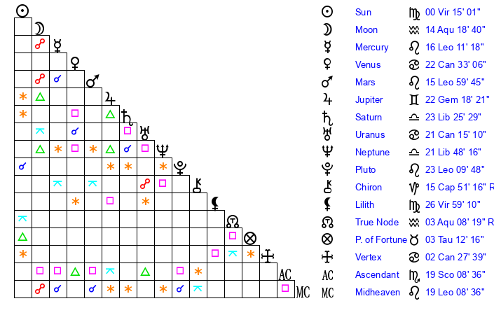 | Moon | 14 Aquarius 18 | 6 Virgo 7 | 7 Libra 28 |