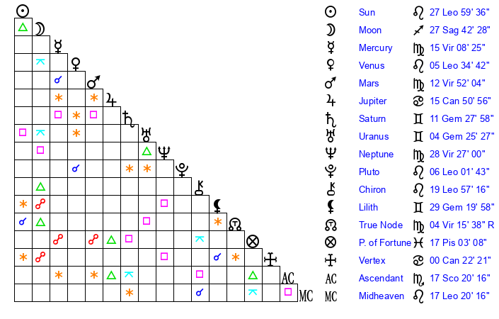 | Sun | 27 Leo 59 | 28 Leo 53 | 19 Scorpio 41 |