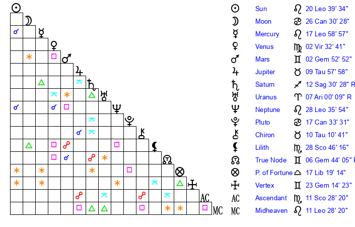 | Sun | 20 Leo 40 | 21 Leo 12 | 26 Scorpio 8 |