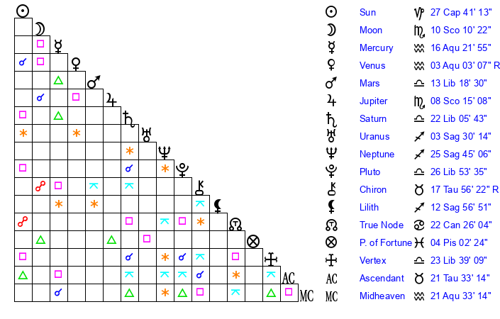 | Saturn | 22 Libra 29 | 15 Pisces 56 | 21 Libra 53 |