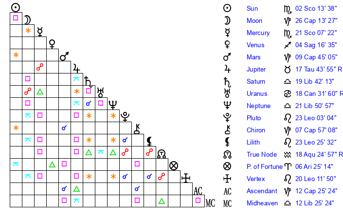 | Sun | 2 Scorpio 13 | 2 Scorpio 32 | 16 Capricorn 6 |
