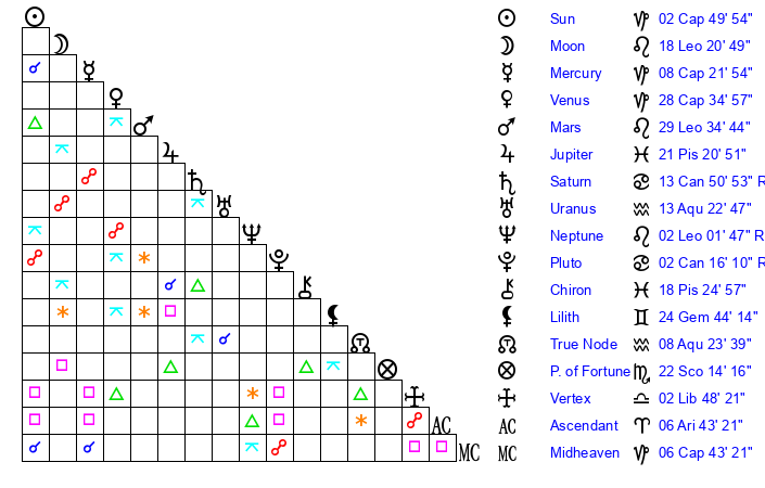 | Neptune | 2 Leo 2 | 27 Pisces 13 | 29 Cancer 52 |