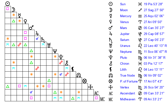 | Venus | 27 Aries 10 | 9 Aries 16 | 15 Aries 9 |
