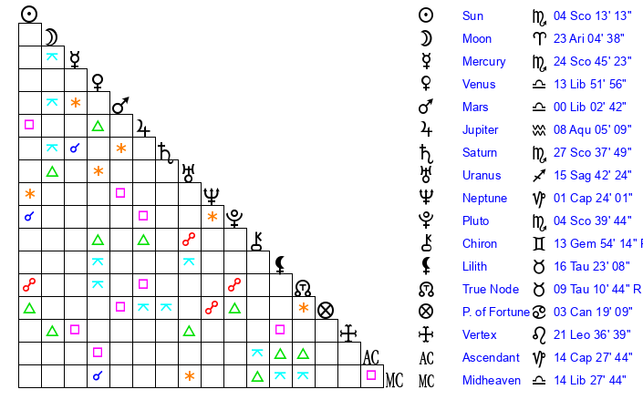 | Sun | 4 Scorpio 13 | 4 Scorpio 32 | 14 Sagittarius 32 |
