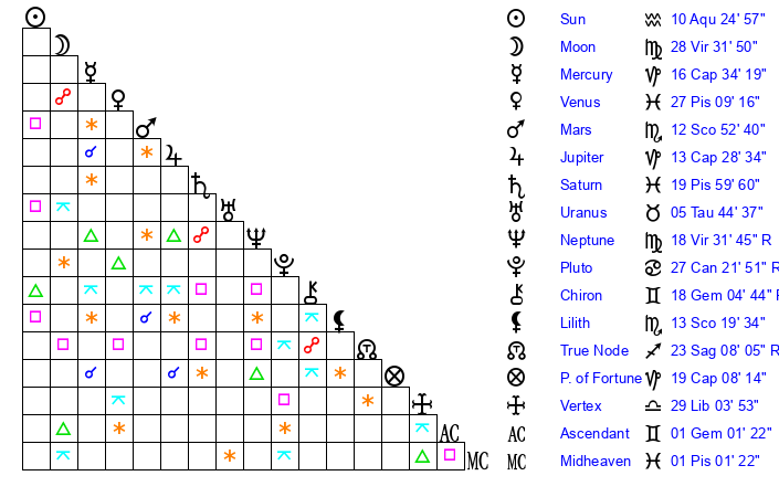 | Moon | 28 Virgo 32 | 26 Aquarius 25 | 11 Sagittarius 11 |