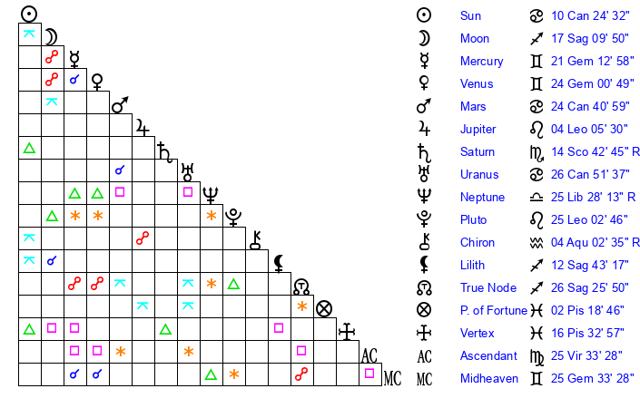 Moon | 17 Sagittarius 12 | 14 Libra 42 | 10 Cancer 46 |