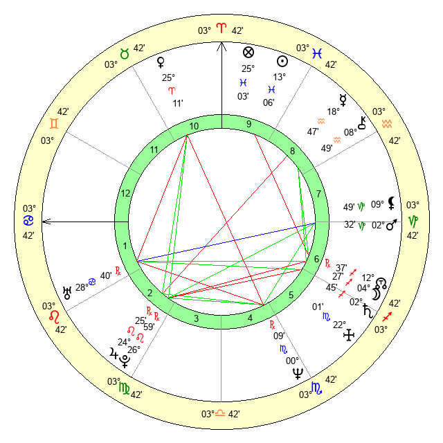 | Venus | 25 Aries 11 | 10 Aries 47 | 2 Cancer 18 |
