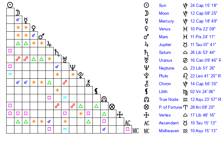 | Sun | 24 Capricorn 15 | 24 Capricorn 32 | 7 Aries 43 |