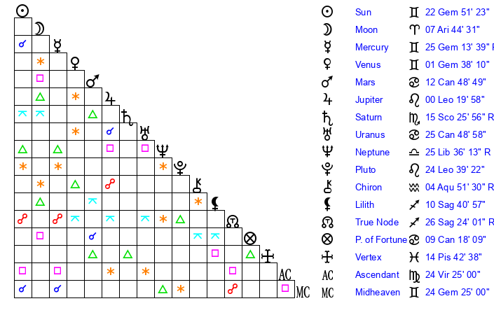 | Sun | 22 Gemini 51 | 23 Gemini 53 | 29 Leo 47 |